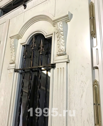 Дверь с массивом, ковкой и стеклом, резьбой, карнизом