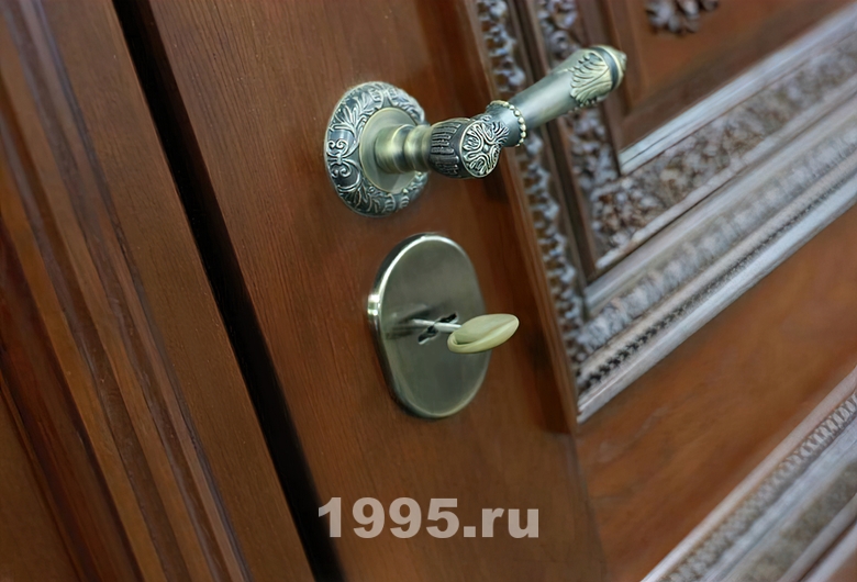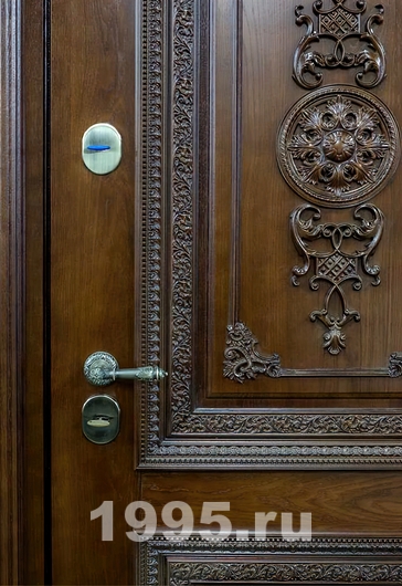 Стальная дверь с массивом дуба, резьбой и карнизом