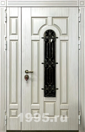 Стальная дверь полуторная филенчатая с ковкой и стеклом